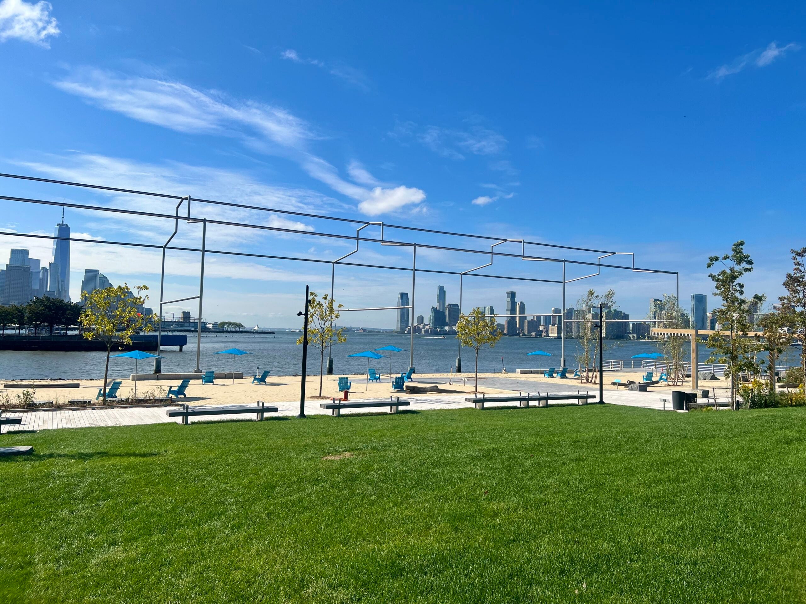 Mit Sand, Sonnenschirmen, Liegestühlen sowie Blick auf die Freiheitsstatue und das neue World Trade Center eröffnete die sogenannte "Gansevoort Peninsula" im Südwesten der Insel am Hudson River - direkt neben dem Whitney Museum, dem High-Line-Park und dem Kunstwerk "Day"s End" von David Hammons, das in den Fluss hineinragt.