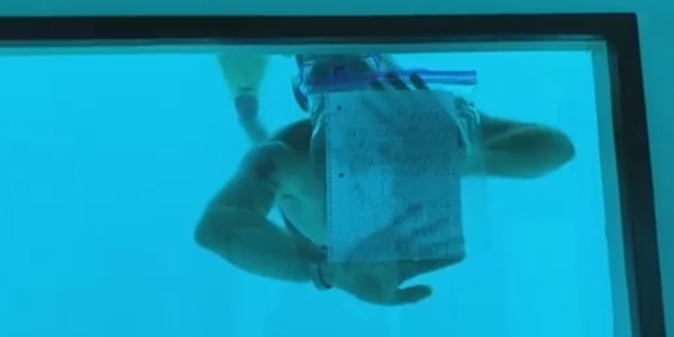 In einem zweiten Clip hat sie den fatalen Heiratsantrag festgehalten. Sie ist im Unterwasser-Schlafzimmer, filmt nach draußen. Weber schwimmt ans Fenster heran, hat eine Taucherbrille auf, an den Füßen Schwimmflossen. Er hält einen Zettel an die Scheibe. Auf der einen Seite steht: „Ich kann die Luft nicht lange genug anhalten, um alles anzuführen, was ich an dir liebe. Aber ich liebe alles jeden Tag mehr.“