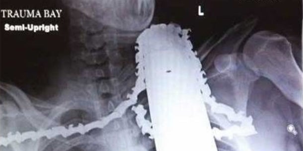 James Valentine (21) aus Pittsburgh war gerade mit einer Kettensäge beim Baumschneiden, als er ausrutschte. Er stürzte so unglücklich, dass sich die Kettensäge fünf Zentimeter tief in seinen Hals bohrte. Ein Mitarbeiter der Rettung berichtet: "Wir haben nur den Motor aus der Kettensäge entfernt, das Sägeblatt ließen wir im Hals stecken. Die Säge nicht zu bewegen, war eine große Herausforderung."