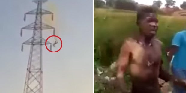 Ein Video zeigt den schockierenden Moment, als ein Mann in rund 30 Metern Höhe an einem Strommasten in eine Hochspannungsleitung gerät. Er wird von 30.000 Volt durchzuckt und stürzt zu Boden.
