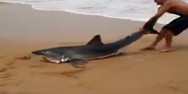 Eine Familie erlebte beim Spaziergang am Strand ein Horror-Szenario. Plötzlich lag vor ihnen ein um sich schnappender Hai am Strand. Der Familienvater reagierte mutig und versuchte den sich in Lebensgefahr befindlichen Fisch zu retten. Er packte den Hai an der Schwanzflosse und versuchte ihn ins Wasser zu ziehen.