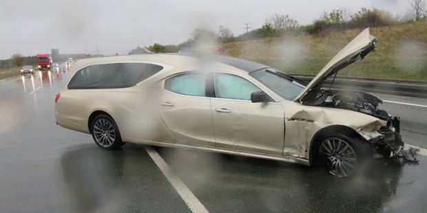 Deutschland. Dieser Luxus-Leichenwagen ist nur noch Schrott. Dabei wird der goldene Maserati auf mehr als 100.000 Euro Wert geschätzt. das ungewöhnliche Auto hat einen V6 Motor und kommt auf 275 PS. Die Gold-Lackierung kommt aus dem italienischen Carrara.