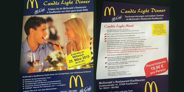 Das Angebot gibt es aber wirklich. Nach einem Begrüßungs-Prosecco kann as verliebte Pärchen aus Chicken McNuggets, Big Mac oder Royal TS wählen, gefolgt von einem McSundae Eisbecher. Es stammt nämlich von einer McDonald's -Filiale im deutschen Kaufbeuren.