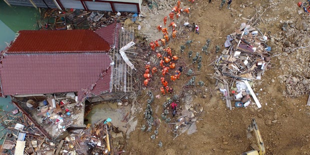 Erde und Geröll hatten sich nach tagelangen schweren Regenfällen gelöst. Mehr als 2.000 Helfer und Spürhunde suchten nach Überlebenden. Bisher konnte aber nur ein Bewohner lebend geborgen werden. Die Bergungsarbeiten wurden durch Überschwemmungen erschwert.