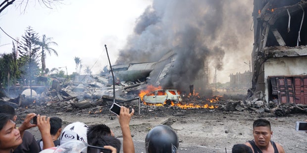 Allein an Bord des Flugzeugs vom Typ Hercules C-130 waren demnach 113 Menschen, darunter 101 Passagiere. Auf die Frage nach möglichen Überlebenden sagte Supriatna: "Nein, nein, keine Überlebenden. Ich komme gerade von der Absturzstelle." Die Maschine sei kurz nach dem Start abgestürzt und in Flammen aufgegangen, teilte die Armee mit. Von Gebäuden in der Nachbarschaft waren nur noch Trümmer übrig. Autos standen in Flammen.