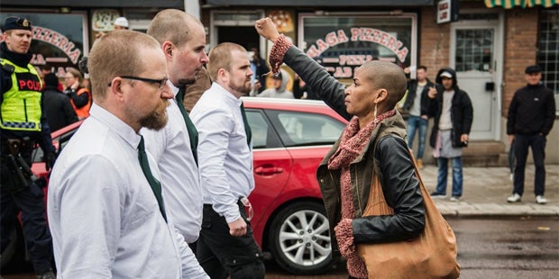 Mit erhobener Faust stellte sich eine schwarze Frau in Schweden einer Neonazi-Demo in den Weg - nun geht das Foto der 42-jährigen Tess Asplund als Symbol gegen Rassismus um die Welt. "Es war meine Nelson-Mandela-Faust", sagte die Aktivistin am Mittwochabend dem schwedischen Fernsehsender Aftonbladet TV.