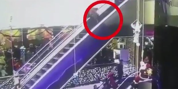 Eine Überwachungskamera filmte den schrecklichen Moment, als eine junge Mutter auf einer Rolltreppe über ihr traditionelles muslimisches Gewand stolperte und dabei ihr Baby fallen ließ. Das kleine Kind fiel zwölf Meter tief starb.