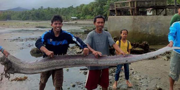 Bei diesem monströsen Fang staunten die philippinischen Fischer nicht schlecht. Der mysteriöse Fang ist mit seinen über 9 Metern mehr als 5 Mal so groß als die Fischer selbst. Unter den Einheimischen wird das Wesen "Erdbeben-Fisch" genannt. Angeblich erscheint das Tier immer kurz bevor die Erde zu beben beginnt.