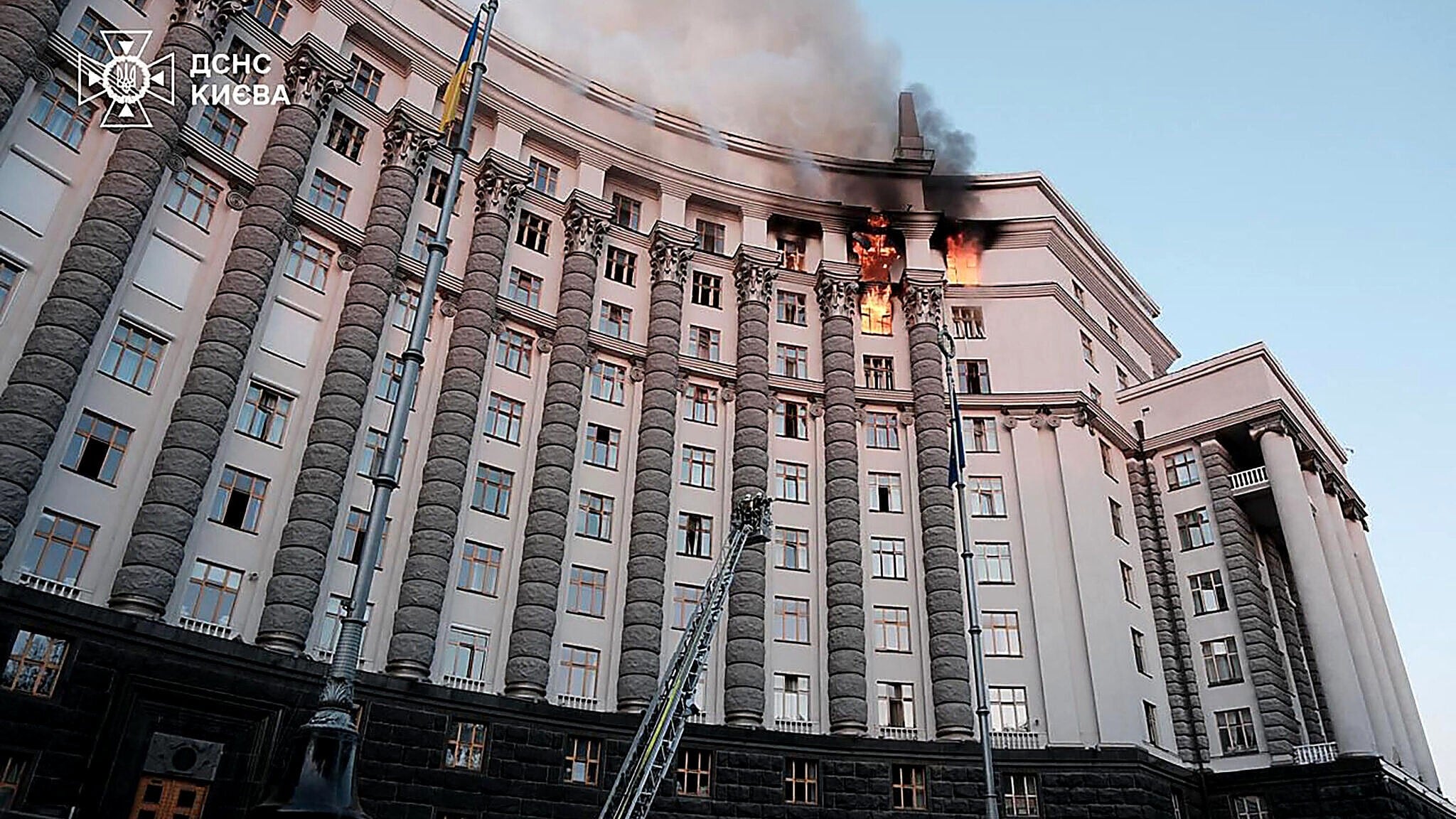 "Zum ersten Mal wurde das Regierungsgebäude durch einen feindlichen Angriff beschädigt - sein Dach und die oberen Stockwerke", teilte Ministerpräsidentin Julia Swyrydenko über den Nachrichtendienst Telegram mit. Reporter der Nachrichtenagentur Reuters beobachteten, wie die oberste Etage des Gebäudes im historischen Stadtteil Petschersk nach Sonnenaufgang in Flammen stand und dichter Rauch in den Himmel stieg.