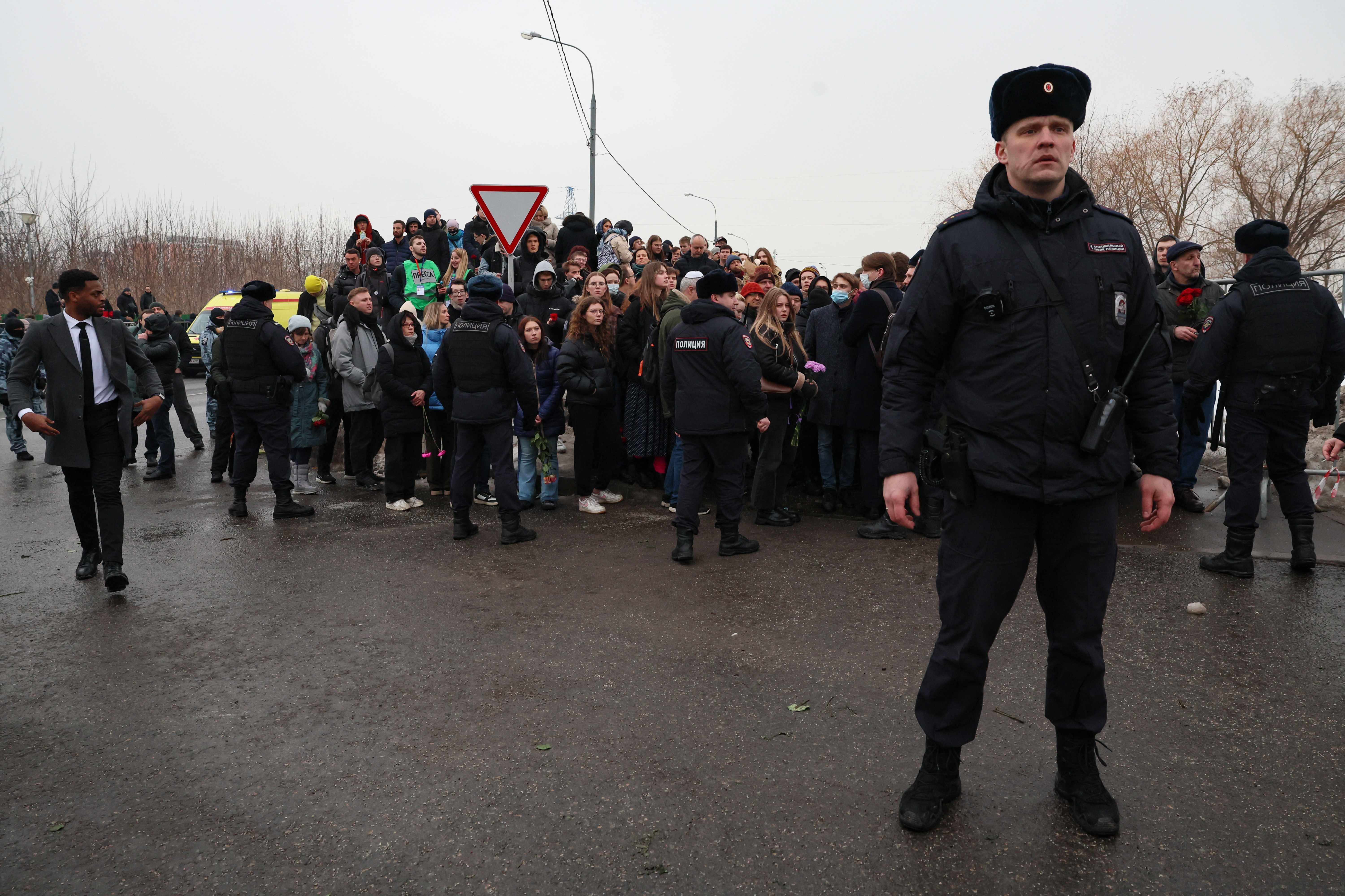 Trotz eines Großaufgebots von Polizei und anderen uniformierten Sicherheitskräften, viele von ihnen maskiert, war der Andrang riesig. Vor der Kirche hatte sich eine zwei Kilometer lange Schlange mit Wartenden gebildet, die sich von Nawalny verabschieden wollten. Viele Menschen klatschten und riefen Nawalnys Namen. Der braune Sarg wurde nach der Trauerfeier wieder aus der Kirche zu Ehren der Gottesmutterikone "Lindere mein Leid" im südöstlichen Bezirk Marjino getragen. Er wurde dann zur Beerdigung transportiert, die für 16.00 Uhr (14.00 Uhr MEZ) auf dem Borissowskoje-Friedhof geplant war.