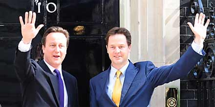 Die erste Koalitionsregierung in Großbritannien seit 1945 nahm am Mittwoch ihre Arbeit auf und wollte noch am selben Tag ihre wichtigsten Ziele vorstellen. Hauptaufgabe des Bündnisses aus konservativen Tories und Liberal-Demokraten (LibDem) dürfte dabei der Abbau der Rekordverschuldung des Landes sein. Beide Parteien hatten sich fünf Tage nach der Wahl auf die Bildung einer Koalition geeinigt. Tory-Chef David Cameron kam am Mittwoch zum ersten Mal mit dem neuen Vize-Premier Nick Clegg von von den Liberaldemokraten in der Downing Street zusammen. Im neuen Unterhaus verfügt die Koalitionsregierung über eine Mehrheit von 76 Sitzen.