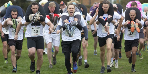 Bei dem kuriosen Rennen über einen 380 Meter langen Parcours mit Hindernissen hängen die Frauen kopfüber am Rücken ihres Partners herunter und mit Po und Oberschenkeln um dessen Hals. Die Teilnehmerinnen müssen mindestens 50 Kilo auf die Waage bringen, sonst wird das Gewicht mit einem Rucksack voller Bohnen erhöht. Das Siegerpaar des "Wife Carrying Race" erhält ein Fass Bier.