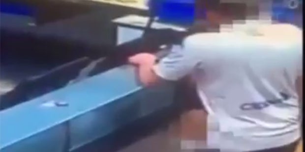 Eine besonders heiße Bestellung gab dieses Sex-Pärchen aus England ab. Während sich der Mann vom Pizza-Take-Away bedienen lässt, bietet auch seine Freundin ihre besonderen Dienste an. Nachdem sie die Bestellung aufgeben, zieht der Mann seiner Geliebten kurzerhand die Hose unter den Po und vergnügt sich mit ihr - mitten im Pizza-Shop. Eine Überwachungskamera zeichnet das wilde Treiben auf.