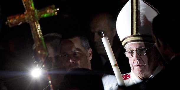 Papst Franziskus hat am Samstagabend gemeinsam mit tausenden Gläubigen die traditionelle Feier der Osternacht eröffnet. Dabei wurde in der Vorhalle des Petersdoms das Osterlicht entzündet. Anschließend zog der Pontifex in einer langen Prozession mit Kardinälen und Bischöfen in den dunklen Petersdom ein. Die Kerzen symbolisieren die Auferstehung Jesu, die von den Christen weltweit gefeiert wird.