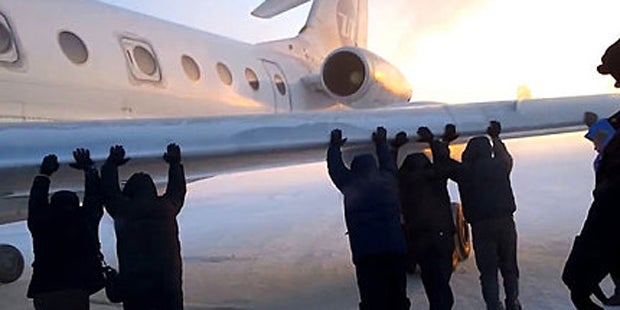 Passagiere eines Linienflugs haben in Sibirien ein festgefrorenes Flugzeug selbst angeschoben. Das Bremssystem der Tupolew Tu-134 sei eingefroren, als die Maschine bei minus 52 Grad einen Tag lang auf dem Flughafen der Stadt Igarka nördlich des Polarkreises gestanden habe, berichtete die Agentur Interfax am Mittwoch unter Berufung auf Behörden.