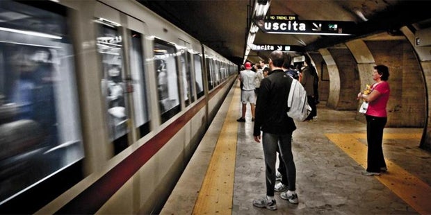 Regen überflutet in Rom regelmäßig Bahnsteige, der veraltete öffentliche Nahverkehr kommt dann stets zum Erliegen. Auch am Freitag richtete das schlechte Wetter wieder ein Verkehrschaos an. Unklar war, ob Wasser auf den Bahnsteig gelaufen war oder ob der Boden nass war, weil die Pendler mit nassen Regenschirmen und Schuhen unterwegs waren.