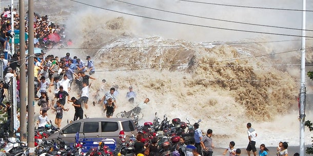 Die Springflut am Qiantang-Fluss in China ist ein großartiges Naturschauspiel, das sich jedes Jahr wiederholt. Für Schaulustige kann es aber ziemlich eng werden. Besonders, wenn die Welle eine Nummer zu groß ausfällt, wie heuer. Der riesige Wasserberg, der bei Flut den Fluss hinaufschießt, riss Dutzende Schaulustige mit sich. 20 Menschen mussten wegen Brüchen und Prellungen verarztet werden.