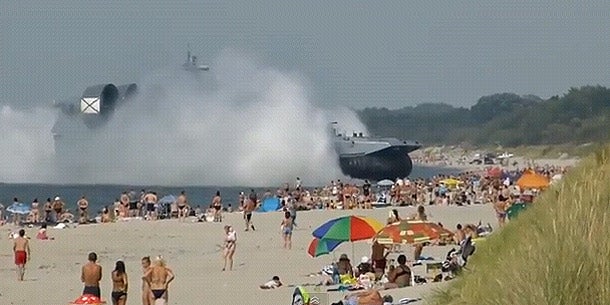 Tausende Badegäste bevölkerten am Sonntag einen Strand in der Nähe von Kaliningrad, als plötzlich ein riesiges Luftkissenboot der russischen Kriegsmarine an Land fuhr.