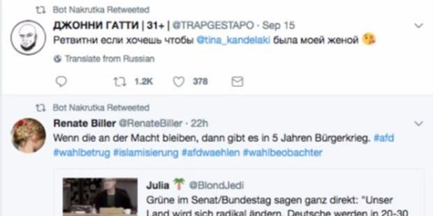 "Die fortwährende Verbreitung von rechtsextremen Nachrichten legt nahe, dass der Bot-Manager entweder ein AfD-Unterstützer ist, oder dass die AfD das russische Bot-Netzwerk dafür bezahlt, ihre Nachrichten zu verbreiten", so die Open Source-Denkfabrik "DFRLab" laut der Zeitung.