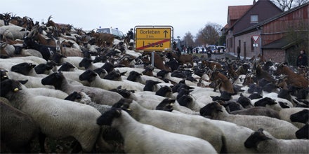 Jetzt unterstützen auch die deutschen Bauern die Castor-Gegner. Mit Schafen und Ziegen wurde eine Straße am Ortseingang Gorleben am Montagnachmittag blockiert. Wie die Polizei die Tiere von der Straße bekommen will, war zunächst unklar. Am Nachmittag wurden die elf Castor-Behälter mit hoch radioaktivem Atommüll in Dannenberg (Niedersachsen) auf Tieflader verladen.