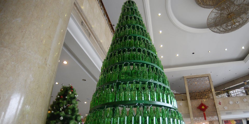 Eine Gruppe Männer baute am Samstag eine 6,50 Meter hohe Tannenbaum-Pyramide aus Schnapsflaschen.