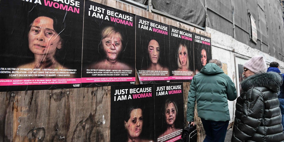 Bilder mit den geschwollenen und blutverschmierten Gesichtern von Angela Merkel, Michelle Obama, Hillary Clinton, Aung San Suu Kyi und Sonia Gandhi sind dieser Tage auf Plakaten in Mailand erschienen. Im Rahmen einer Kampagne zur Bekämpfung von Gewalt gegen Frauen lancierte der Mailänder Künstler und Aktivist AleXsandro Palombo eine Plakatierungsaktion an bekannten öffentlichen Orten in Mailand.