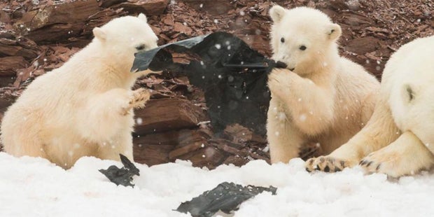 Eigentlich sollte es doch etwas Schönes sein: Zwei Eisbären-Junge wurden dabei fotografiert, wie sie auf der norwegischen Inselgruppe Spitzbergen neben ihrer Mutter im Schnee spielen. Doch das "Spielzeug" der Jungtiere verstört das Internet - es handelt sich dabei um eine schwarze Plastikplane.