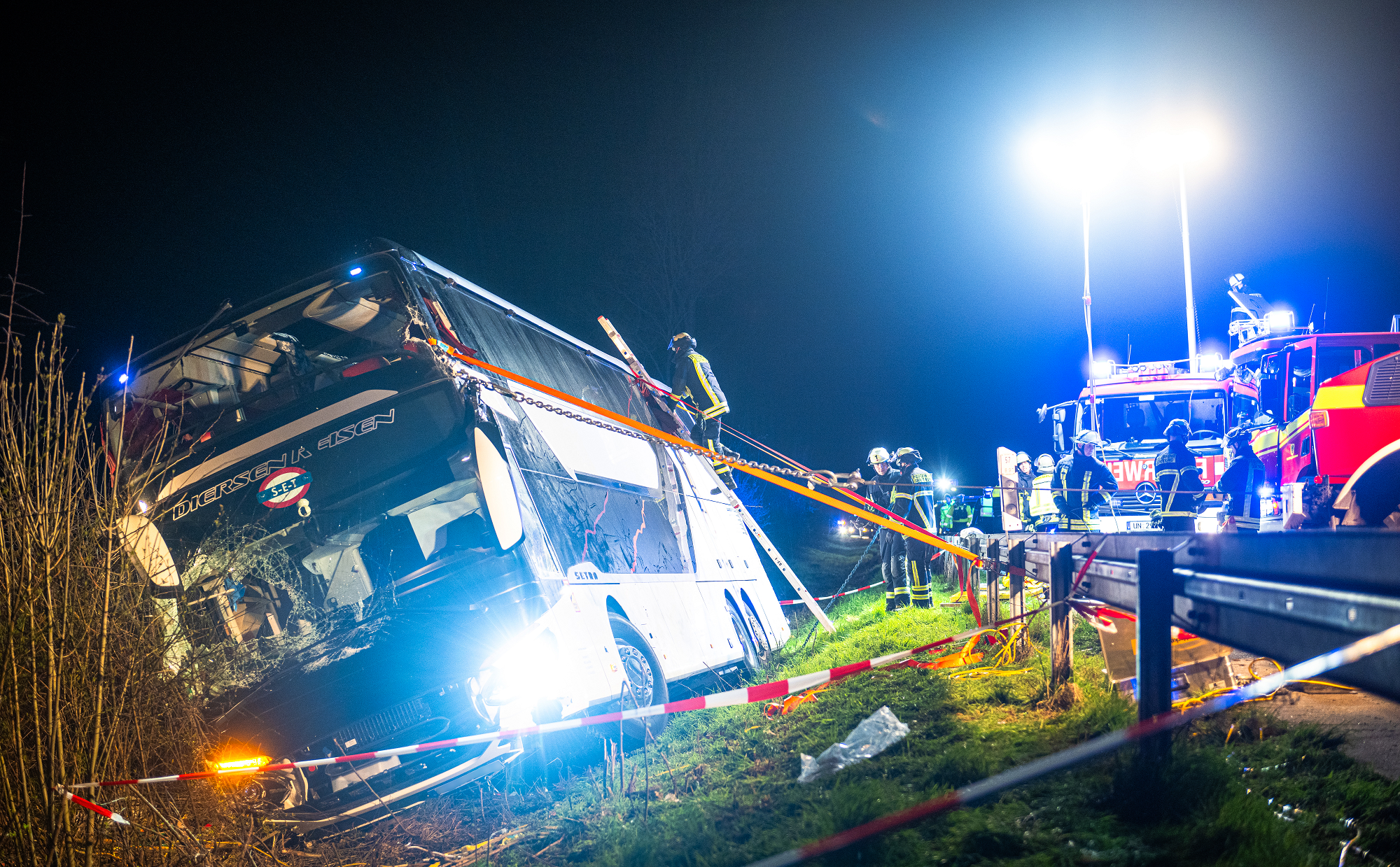 Die A44 wurde nach dem Unfall von den Ausfahrten Unna Ost bis Werl einseitig voll gesperrt. Die Sperrung dürfte laut Polizei bis etwa 9.00 Uhr anhalten. Der schwer beschädigte Bus musste vor der Bergung aufgerichtet werden. Neben der Feuerwehr war auch ein Rettungshubschrauber im Einsatz.