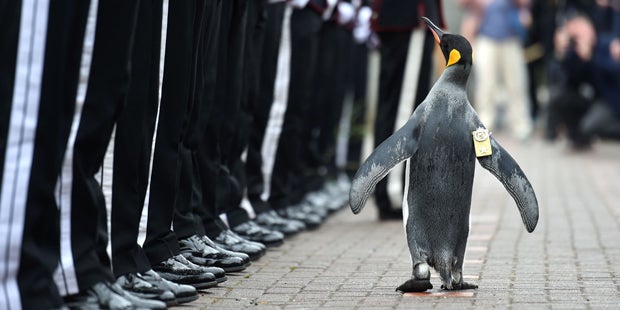 Ein Königspinguin ist am Montag an mehr als 50 in Reih und Glied aufgestellten Soldaten der Leibgarde des norwegischen Königshauses entlanggewatschelt. Der Auftritt im Tiergarten der schottischen Hauptstadt Edinburgh gehörte zu einer Zeremonie mit langer Tradition. Der Pinguin namens Sir Nils Olav wurde bei der Gelegenheit zum Brigadegeneral befördert.