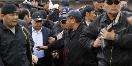 Die russische Nachrichtenagentur Interfax berichtete, Bakijews Leibwächter hätten in die Luft geschossen. Der gestürzte kirgisische Präsident habe nach den Schüssen "Rennt nicht, rennt nicht!" in Richtung der in Panik flüchtenden Menge gerufen. Anschließend suchte Bakijew demnach in einem Theater Deckung und wurde schließlich in einem Geländewagen in Sicherheit gebracht.