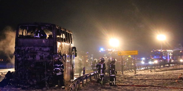 Insgesamt waren 55 Menschen in dem Bus. Sie konnten sich alle aus dem Fahrzeug retten. Die Insassen schlugen die Scheiben ein und verließen so das obere Deck. Es wurde durch den Brand zerstört. Fünf Schüler erlitten Rauchgasvergiftungen, zehn Schüler hatten leichte Schnittverletzungen und Prellungen.