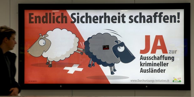 Noch simpler hätte man die Forderung kaum rüberbringen können: Ein weißes Schaf auf der roten Fahne mit dem Schweizer Kreuz befördert ein schwarzes Schaf mit einem kräftigen Hinterteil-Tritt nach draußen. "JA zur Ausschaffung krimineller Ausländer", steht auf Postern neben den beiden Schafen. Die rund fünf Millionen wahlberechtigten Eidgenossen sollen entscheiden: Sollen straffällig gewordene Nichtschweizer automatisch des Landes verwiesen werden? Raus mit den "schwarzen Schafen", ohne Wenn und Aber - und ohne dass Richter bei eventuellen Härtefällen eine Ausnahme verfügen dürften?