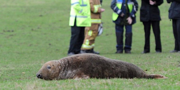 Eine Frau entdeckte beim Hundespaziergang den ungewöhnlichen Gast, fotografierte ihn und stellte das Foto ins Internet, wo es rasch für einige Furore sorgte. Unter Anteilnahme zahlreicher Schaulustiger und angelockt von einem Fisch robbte das verschreckte Tier über das Gras bis in einen Anhänger und wurde zu einer Tierklinik gebracht, wo es untersucht wurde. Nach Angaben der Polizei war die kleine Robbe völlig erschöpft. Sie werde nun wieder aufgepäppelt und dann ins Meer zurückgebracht.