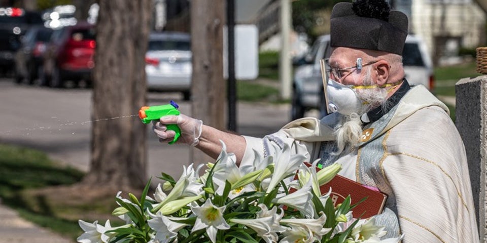 Das Coronavirus zwingt zu außergewöhnlichen Maßnahmen: Ein katholischer Pfarrer hat im US-Bundesstaat Michigan zur Spritzpistole gegriffen, um trotz der Pandemie Osterkörbe von Gemeindemitgliedern zu segnen.
