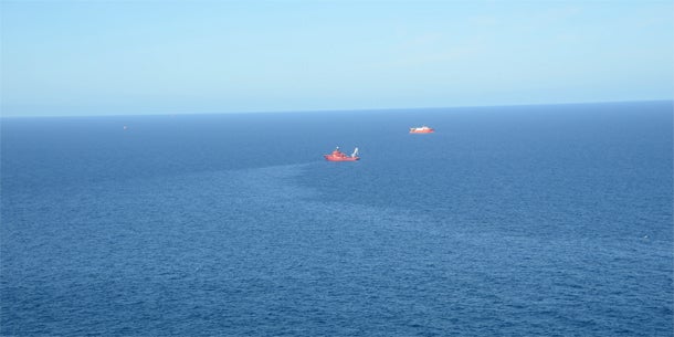 Aus der Luft entdeckt ein Heli den Ölteppich vor Schottland.