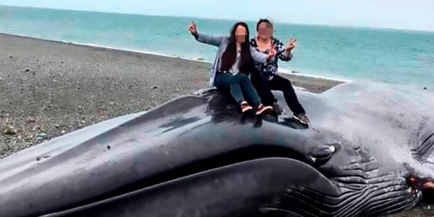 Strandbesucher stampfen auf einem Wal-Kadaver, machen auf ihm Selfies und ritzen ihre Initialen in die Haut des toten Tieres. Das Tier strandete an der chilenischen Küste. Reihenweise machten Strandbesucher Selfies von sich und dem toten Wal.