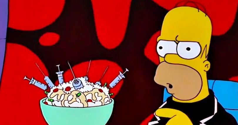 Eine Szene zeigt, wie Homer einen mit Spritzen gefüllten Erdbeereisbecher isst, der ihn in einen Drogenrausch versetzt.