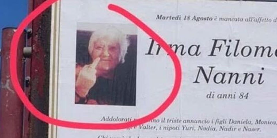 Ein Todesanzeigen-Plakat, das dieser Tage in einer Ortschaft bei Rimini erschienen ist, sorgt in Italien für Diskussionen. Abgebildet ist ein Foto der 84-jährigen Verstorbenen, auf dem sie lachend den Mittelfinger zeigt. Das ungewöhnliche Bild, das in mehreren Vierteln der Kleinstadt zu sehen ist, wurde auch auf Facebook veröffentlicht und löste Aufsehen aus.