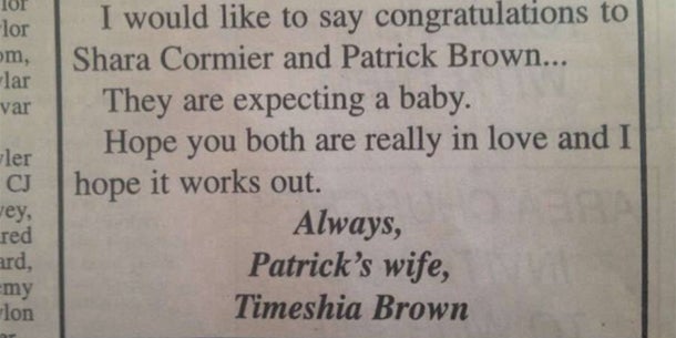 "Ich würde gerne Shara Cormier und Patrick Brown gratulieren. Sie erwarten ein Baby. Ich hoffe, ihr beide seid wirklich ineinander verliebt und dass alles klappt." So nett wird Shara und Patrick in einer Zeitungsanzeige zur bevorstehenden Geburt ihres gemeinsamen Kindes gratuliert. Dumm nur, dass die Anzeige von Patricks Ehefrau Timeshia ist.