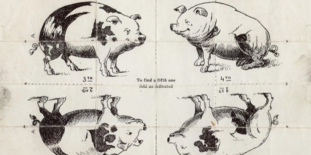 „Wo ist das fünfte Schwein?“ Dieses Faltblatt aus dem Jahr 1939 macht derzeit in den sozialen Medien die Runde. Dabei sieht man auf einem Zettel zunächst nur vier Schweine, nach horizontalem und vertikalem Knicken ergibt sich dann aber ein Bild von Adolf Hitler.