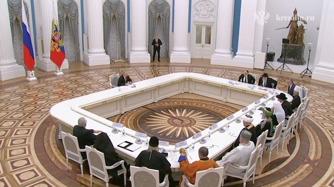 Am Mittwoch traf Putin im Kreml 13 religiöse Führer verschiedener Glaubensrichtungen. Während die Geistlichen auf einer Seite des Tisches nebeneinander kauern mussten, hat der Kreml-Chef die andere Hälfte für sich allein.