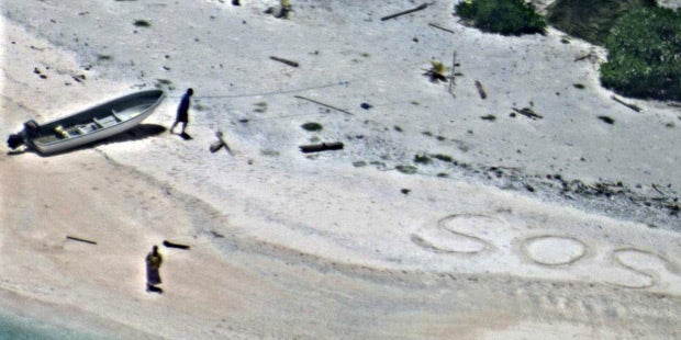 Mit einem Hilferuf im Sand haben zwei in Mikronesien gestrandete Seeleute auf sich aufmerksam gemacht.