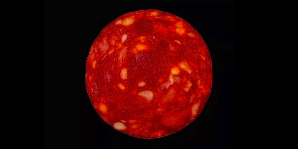 Ein roter Feuerball mit leuchtenden Flecken vor rabenschwarzem Hintergrund - eine angebliche Aufnahme des James-Webb-Weltraumteleskops hat sich als Scheibe Chorizo-Wurst entpuppt.
