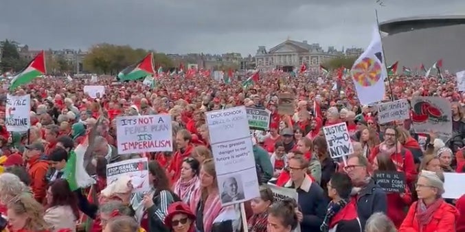 Man wolle, dass die Regierung Druck auf Israel ausübe, um eine Waffenruhe zu erreichen, sagt die Direktorin der Organisation PAX Niederlande, Rolien Sasse, zur Kundgebung unter dem Mott "Rote Linie". Die Teilnehmerzahl von 250.000 wurde von den Veranstaltern genannt und von der Polizei bestätigt.