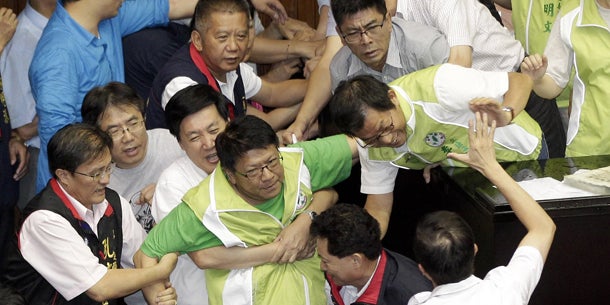 Eine hitzige Parlamentsdebatte um ein neues Atomkraftwerk hat in Taiwan mit einer Schlägerei geendet. Dutzende Parlamentarier aus rivalisierenden Lagern gingen am Freitag aufeinander los und versuchten, das Rednerpult zu erklimmen. Das Fernsehen übertrug Livebilder, auf denen sich zwei männliche Abgeordnete auf dem Boden prügelten und von Kollegen auseinander gezogen werden mussten, während andere sich gegenseitig mit Wasser aus mitgebrachten Flaschen bespritzten.