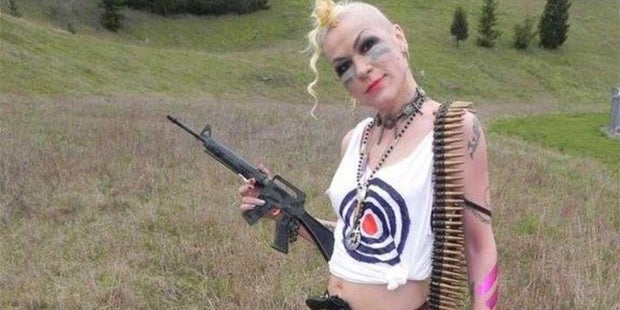 Ein Foto eines grell geschminkten Luders sorgt im Internet für Furore. Die Frau steht auf einer Graslandschaft und posiert mit einem Spielzeug-Gewehr in der rechten Hand und falschen Munitionen auf ihrer Schulter. Ihr Outfit: Ein knappes Tank-Girl-Outfit. Es handelt sich um ein Facebook-Post von Chrese Evans (44). Russische Blogger entdeckten das Foto und haben es mehrfach geteilt.