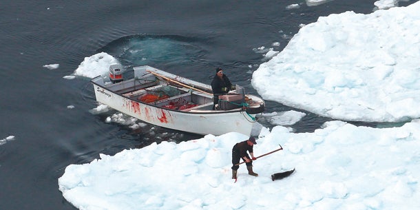 Brutaler geht’s nicht: Kanadische Jäger, bewaffnet mit einer Art Baseballschläger, dreschen vor der Küste Neufundlands auf wenige Wochen alte Robbenbabys ein, spalten ihnen die Schädel, sodass sich das Eis in Sekundenschnelle blutrot färbt. Dann zerren sie die noch zappelnden Tiere mit einem Enterhaken in ihre Fischkutter. Letzte Woche begann die alljährliche kanadische Robbenjagd im „The Front“ genannten Gebiet. Und allein in den ersten drei Tagen wurden 10.304 Robbenbabys abgeschlachtet.