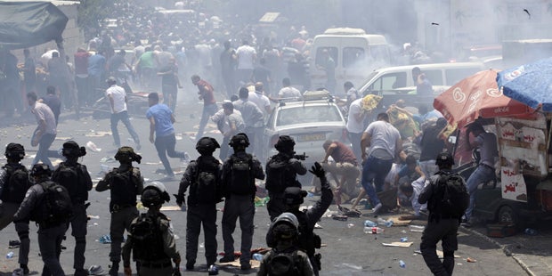 Binnen 24 Stunden wurden in dem Konflikt zwischen Israel und Palästina sechs Menschen getötet - drei Palästinenser am Freitag bei Protesten, wenige Stunden später erstach ein Palästinenser drei Israelis im besetzten Westjordanland. Die palästinensische Regierung setzte aus Protest gegen die verstärkten Zugangskontrollen alle Kontakte zu Israel aus.