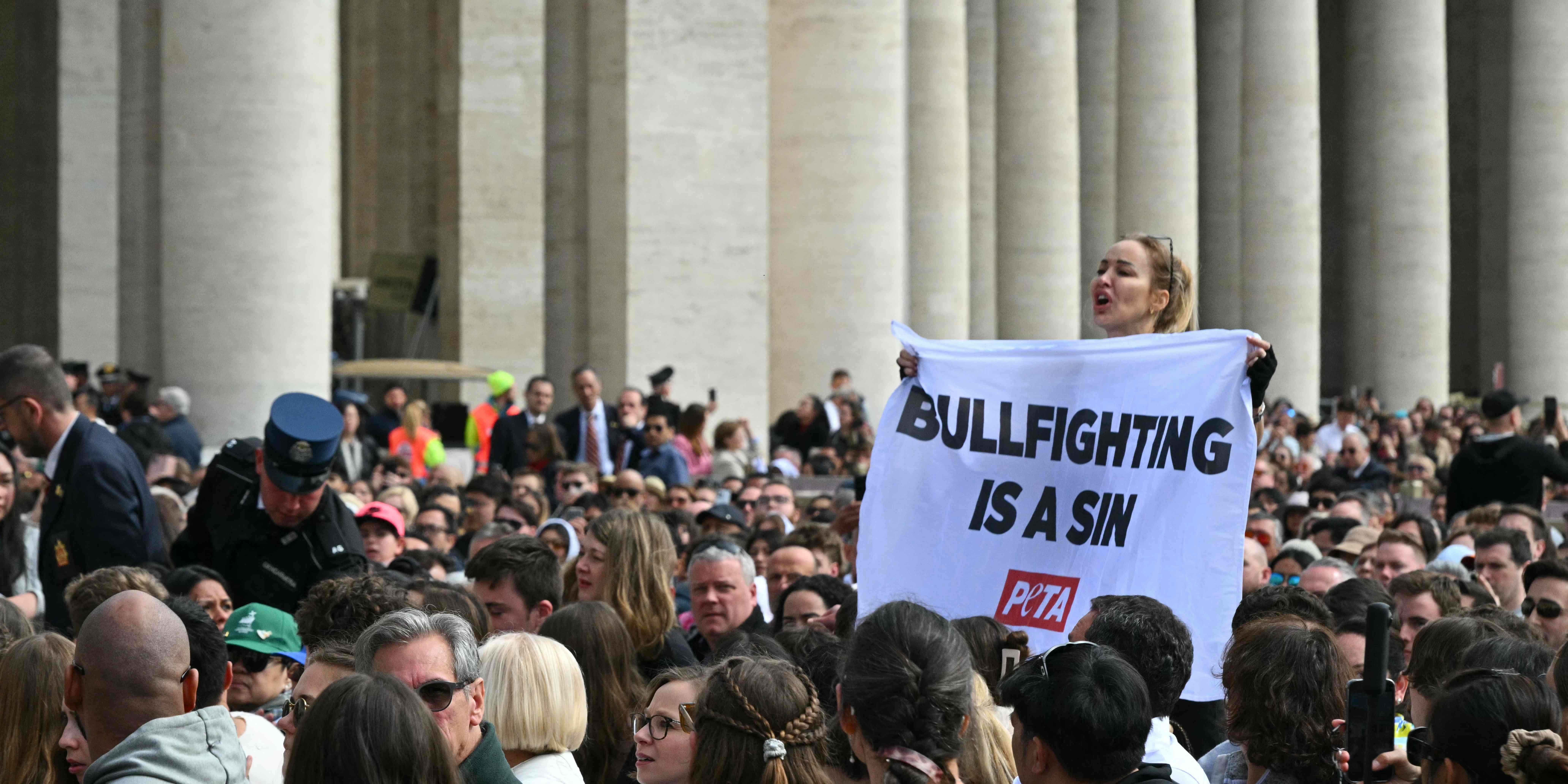 Eine Aktivistin der NGO PETA ("People for the Ethical Treatment of Animals") hat auf dem Petersplatz im Vatikan gegen die Segnung von Stierkämpfen vor der Ostermesse demonstriert.