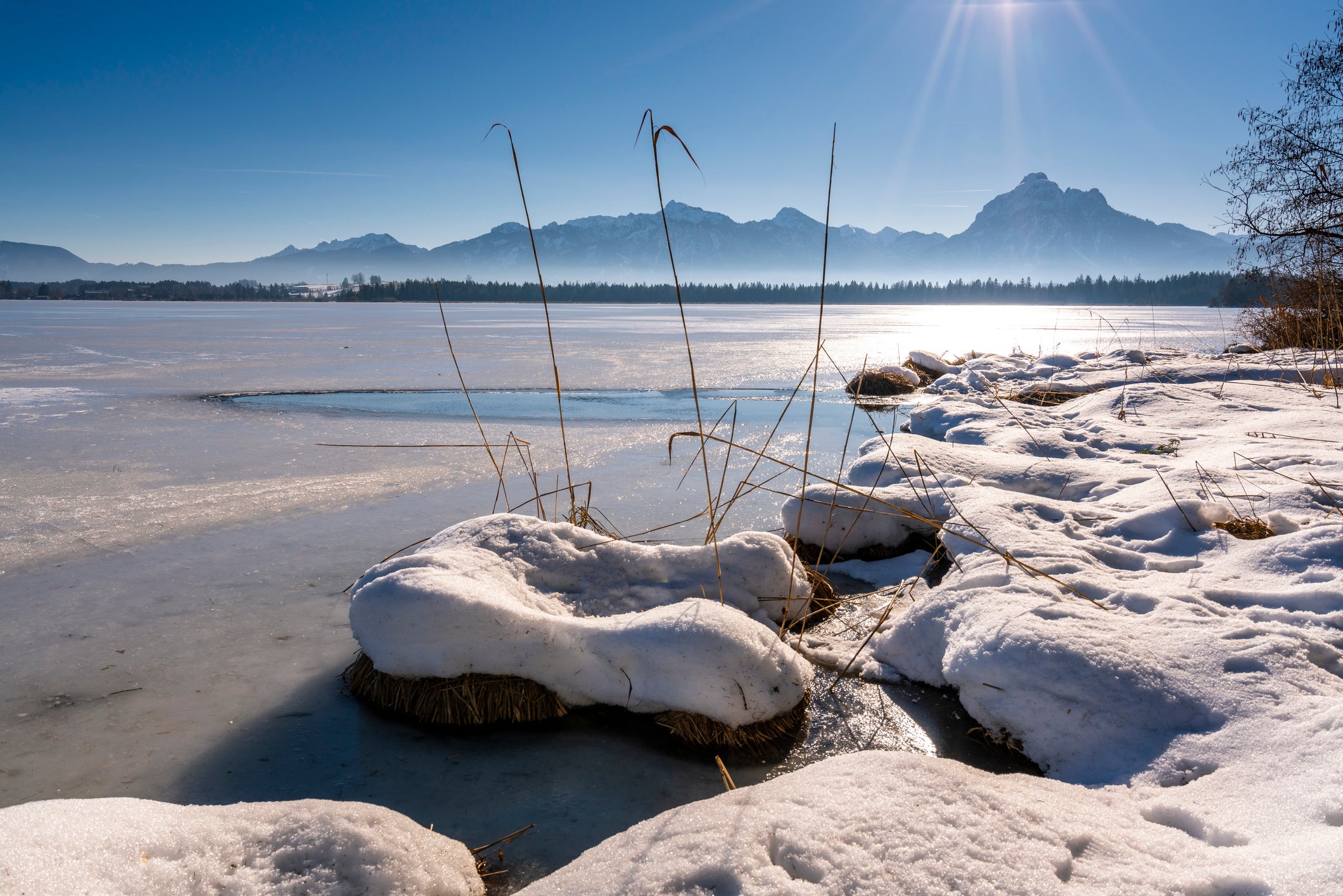 Ein Tourist ist am Montagnachmittag auf dem zugefrorenen Hopfensee bei Füssen im deutschen Ostallgäu mit einem Mietwagen eingebrochen. Der 26-Jährige hatte geplant, bei sonnigem Wetter ein Fotoshooting vor der Bergkulisse zu machen und fuhr dafür mit dem Wagen rückwärts auf die Eisfläche. Doch die hinteren Räder des Fahrzeugs brachen ein, da die Winterreifen nicht ausreichten, um den Wagen weiter zu bewegen.